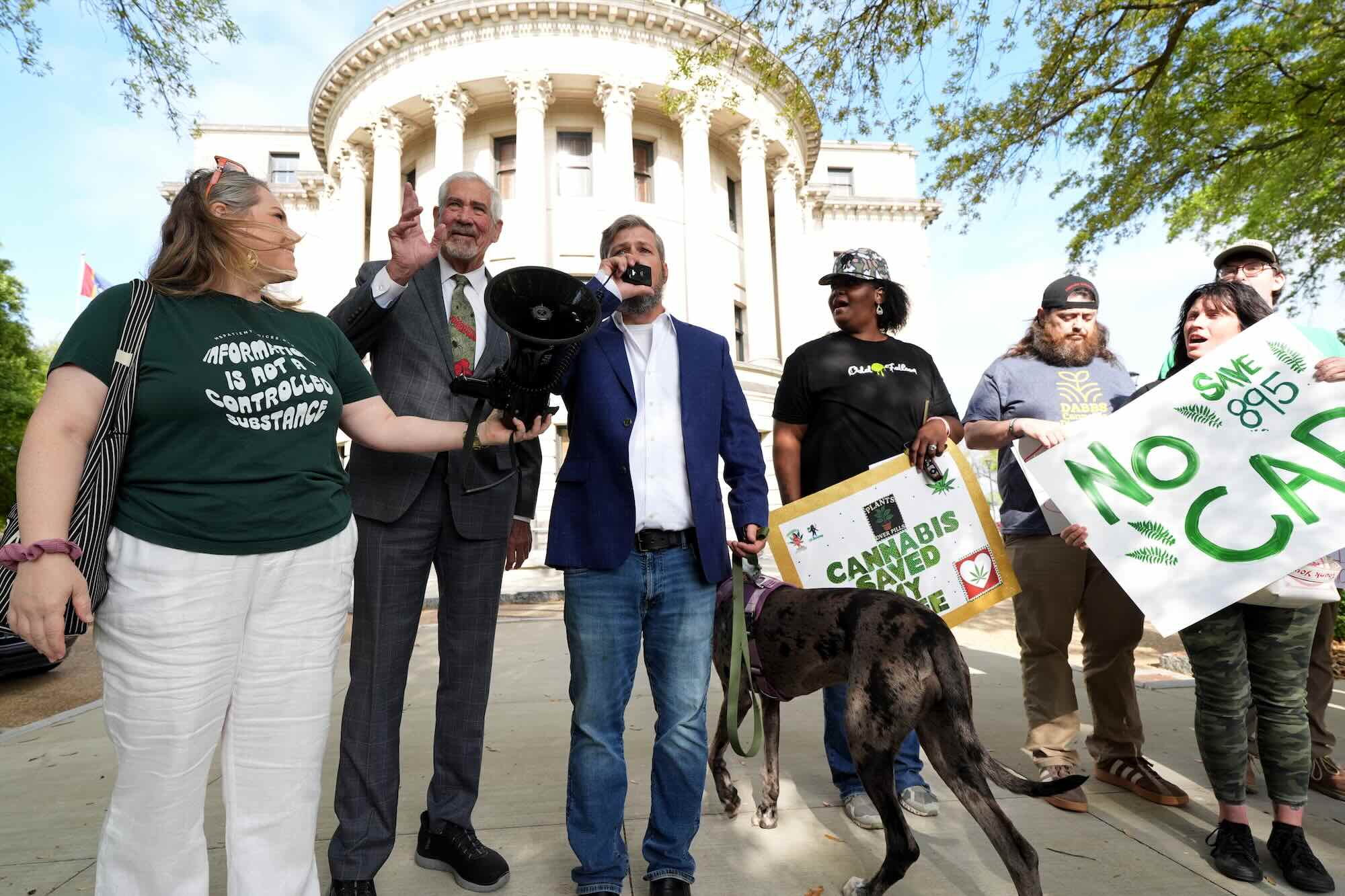 Watkins, a U.S. Army veteran, led the protest alongside his service dog, a Great Dane-Bull Mastiff mix named Brooklyn Rza, and Elizabeth Feder-Hosey, the Founder of Mississippi Patient Voices.